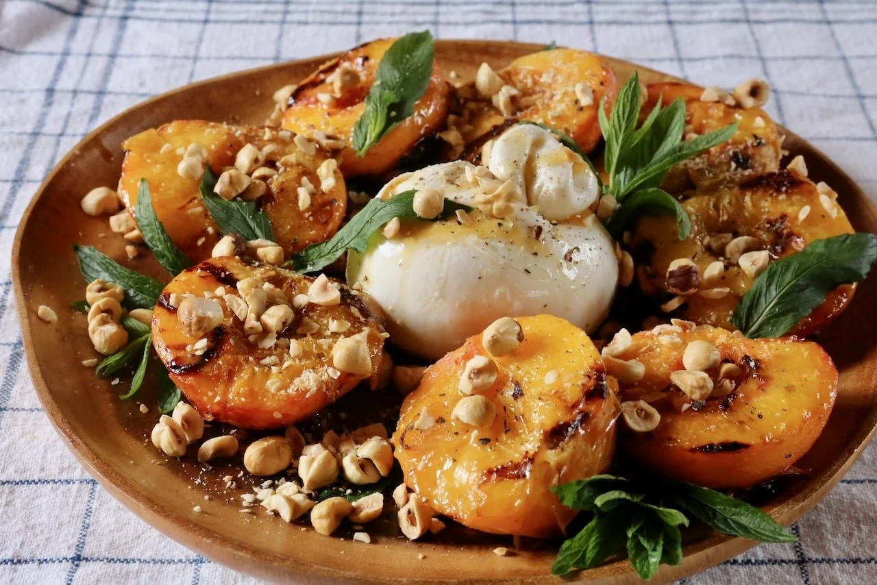 Serve it with grilled peaches—warm, a little smoky, and sweet—alongside soft burrata cheese. Add some toasted nuts for crunch, fresh basil for brightness, and a drizzle of honey and balsamic vinegar to bring it all together. Or pile it on toasted bread for an easy summer snack. The wine’s fresh, crisp flavor pairs naturally with the creamy cheese and sweet, juicy fruit.